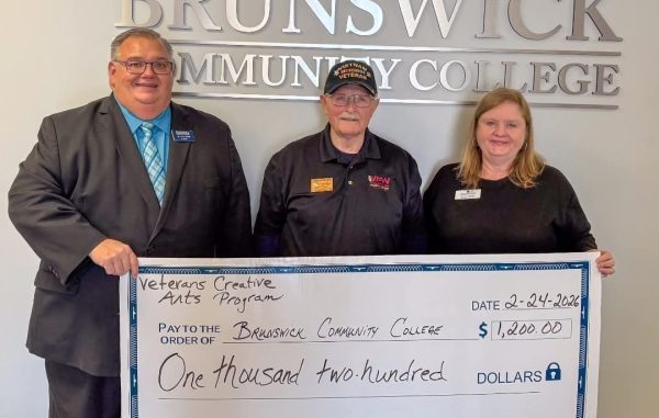 Bolivia, NC — Gerald Decker, a member of VFW Post 12196 in Leland, visited Brunswick Community College to present Dr. Gene Smith and Teresa Nelson with a $1,200 gift establishing the Beadles Family Scholarship, sponsored by the Veterans Creative Arts Program.