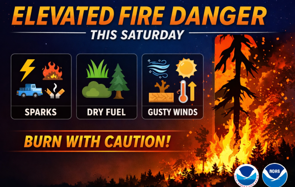 Even a small spark can ignite dry vegetation and escalate rapidly under Saturday’s weather pattern. Use extreme caution with any outdoor flame, machinery, or heat source.
