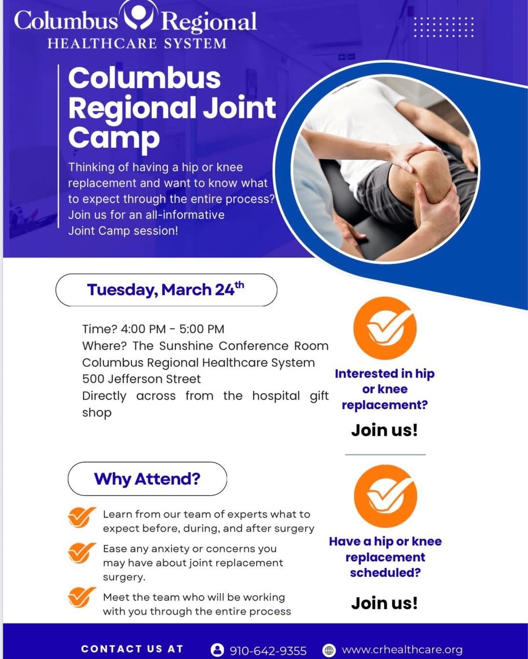 Columbus Regional Healthcare System will hold its next Joint Camp on Tuesday, March 24 at 4:00 p.m., offering a detailed look at what patients can expect before, during, and after hip or knee replacement surgery.