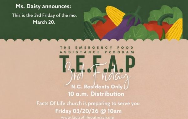 TABOR CITY, NC — Ms. Daisy with Facts of Life Church announces that this Friday, March 20, is the regularly scheduled 3rd‑Friday T.E.F.A.P. food distribution. North Carolina residents are invited to receive assistance beginning at 10:00 a.m. at 24678 Peacock Road, Tabor City.