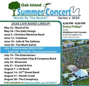 All concerts in Oak Island’s 2026 Bands by the Beach Summer Concert Series are FREE and open to the public. Bands preform from 6:30 p.m. to 8:30 p.m. every Friday at the Middleton Park Complex, 4610 E Dolphin Drive, with one special mid‑week Beach Day event on Wednesday, July 1, running 6:00 p.m. to 9:00 p.m.