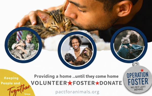 Operation Foster is a service proudly provided by PACT for Animals a 501(c)(3) nonprofit. Operation Foster specializes in long‑term foster care for pets belonging to deployed service members and veterans undergoing medical care.