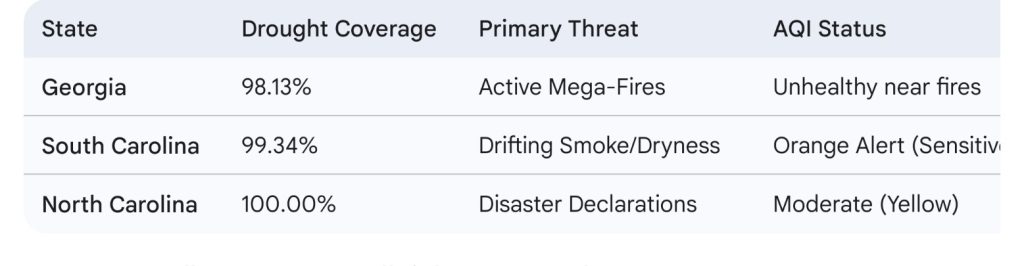 ​The Southeast is currently navigating a severe environmental emergency as record-breaking drought conditions fuel massive wildfires and hazardous air quality across Georgia and the Carolinas.