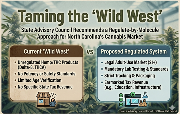 The push comes following a detailed review of the state’s legal landscape, which found a massive regulatory gap in North Carolina’s retail market. Currently, thousands of storefronts across the state are legally selling products, such as Delta-8, Delta-10, and THCA, with virtually no state oversight.
