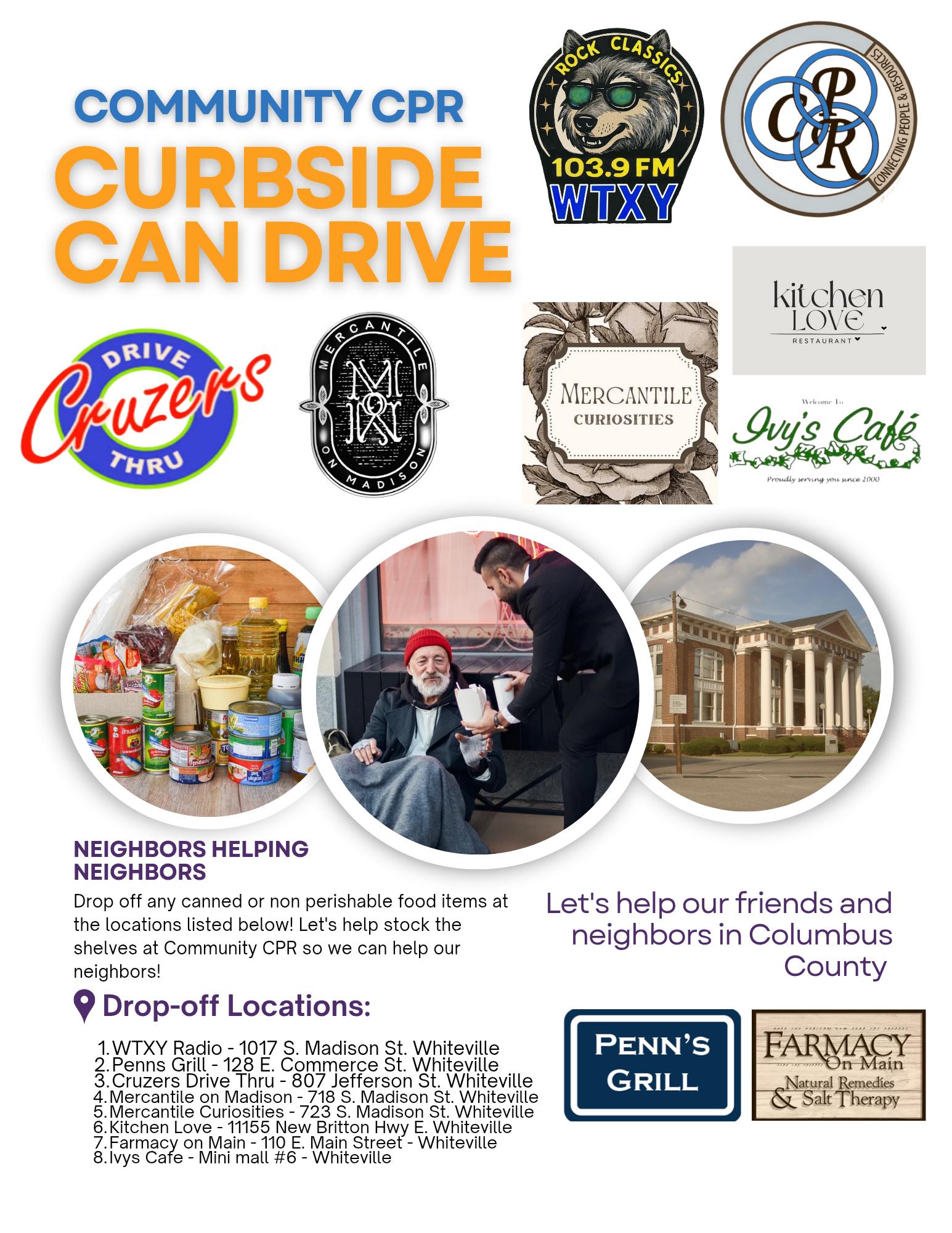 WHITEVILLE, NC — A coalition of local businesses is teaming up to support neighbors in need through the Community CPR Curbside Can Drive, a grassroots food collection effort aimed at restocking the shelves at Community CPR.
